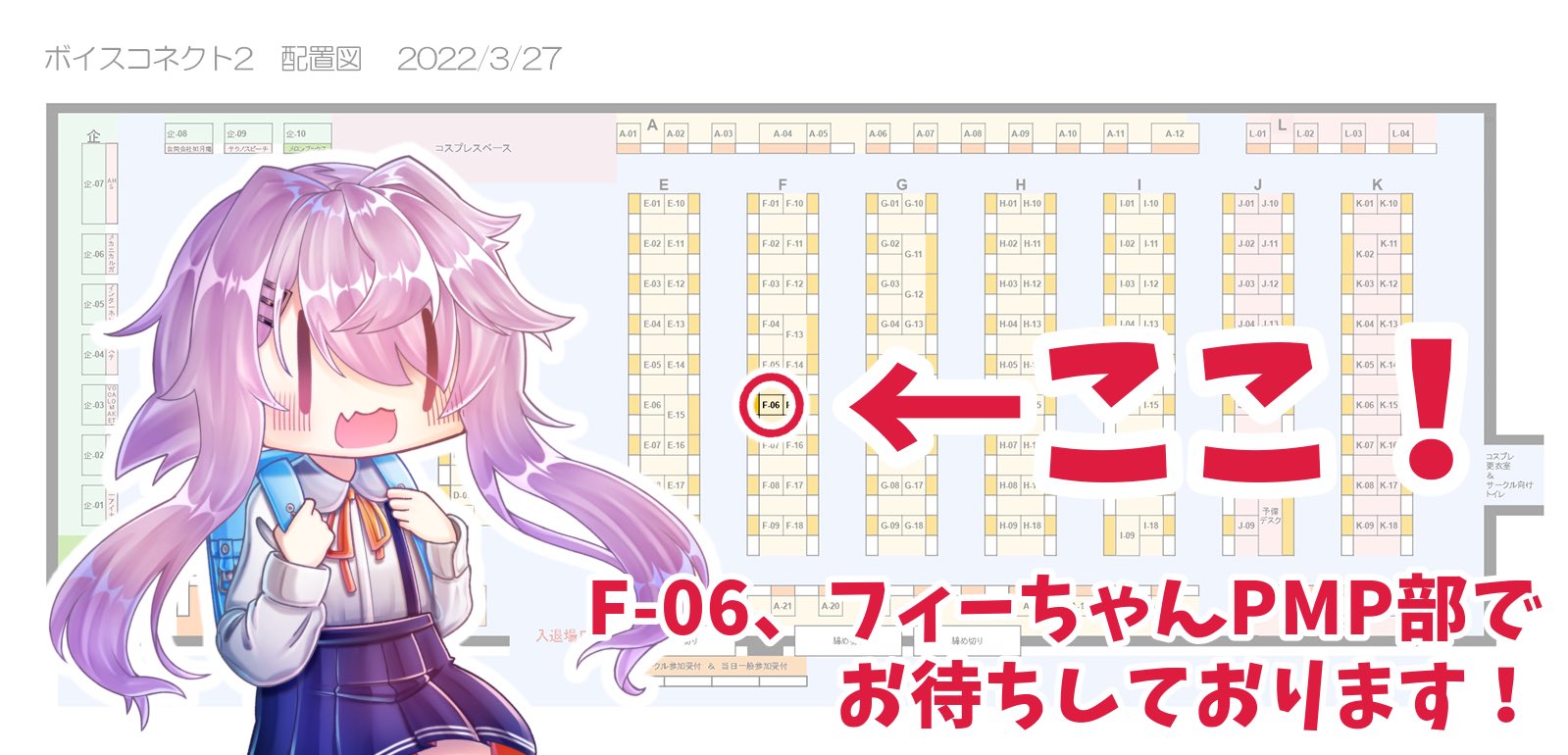 3月170022 ボイスコネクト2 サークル参加 出展 3月27日に開催される、ボイスコネクト2にサークル名「フィーちゃんPMP部」として参加しております。 総勢21名によるイラスト・四コマ・SS合同本や、フィーちゃんに関するグッズを販売予定です。 サークルの場所は「F-06」になります。販売ページ プレスリリース