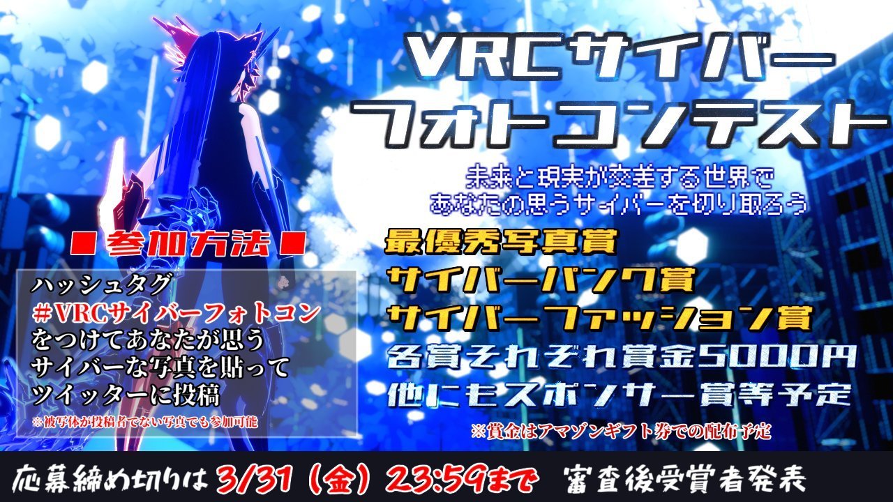 3/18サイバーの日に合わせて、Twitterにてハッシュタグ #VRCサイバーフォトコン をつけて投稿されたVRC内での写真をコンテスト形式で審査し受賞作品を決定する企画。